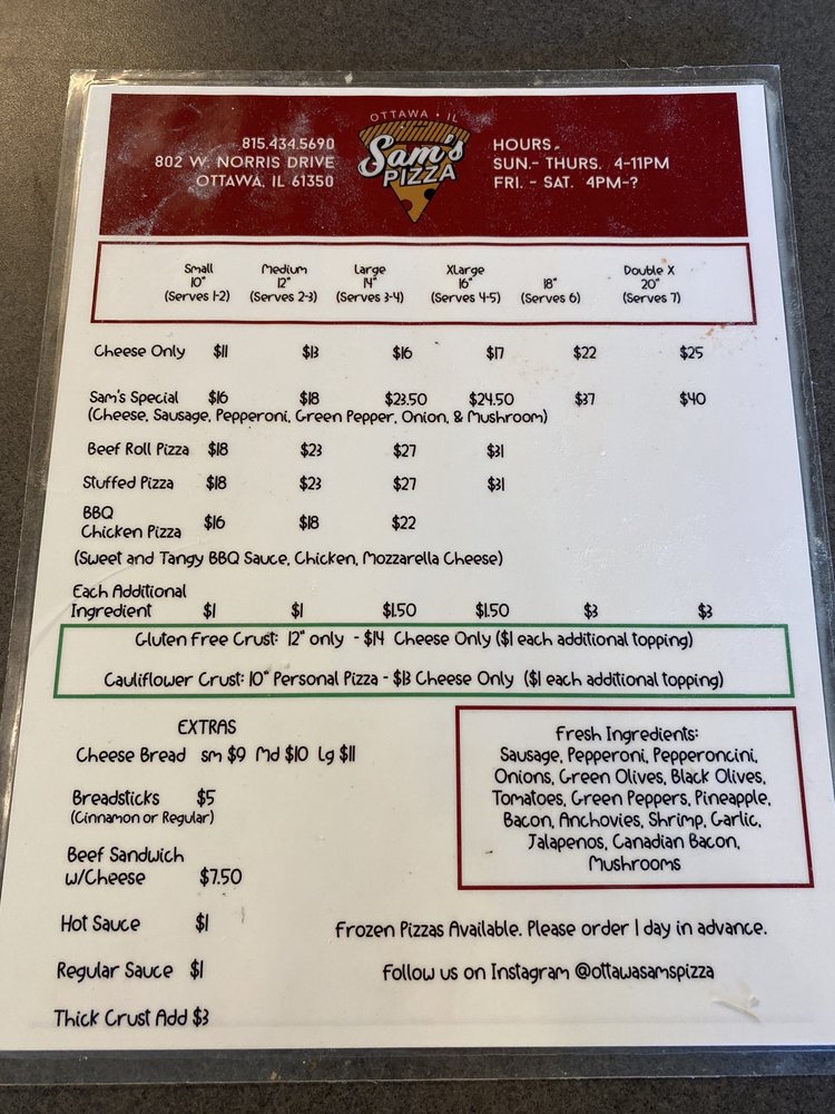 Introducing Sam's Pizza, a delightful staple in Ottawa, IL, that serves up slices worth savoring. This pizzeria is renowned for its generous toppings, mouthwatering sauce, and a harmonious blend of flavors, all at reasonable prices. Whether you prefer the convenience of delivery or the charm of dining in, Sam's offers a myriad of options including takeout, outdoor seating, and catering services.